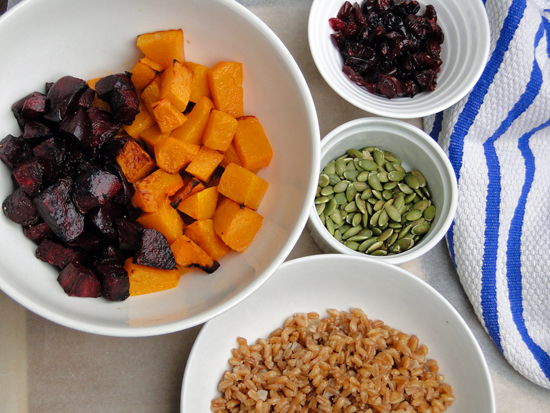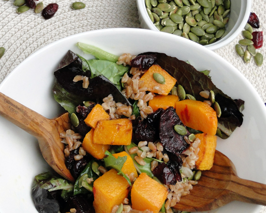 In a salad bowl toss salad vegetables with enough dressing to coat. Place squash and beets on pinnacle. Sprinkle with feta, cranberries, farro and pumpkin seeds.
